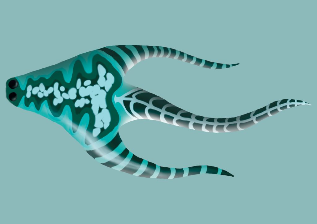 Mein Name in einem selbstgemachten Schriftzug, den ich mit Pinsel auf Papier gemalt habe. Danach habe ich die Formen in Illustrator nachgezeichnet, symmetrischer gestaltet und Farbe hinzugefügt. Mein Schriftzug sollte wellig sein, da mein Name Ocean ist. Ich habe versucht, etwas Schwungvolles zu machen.