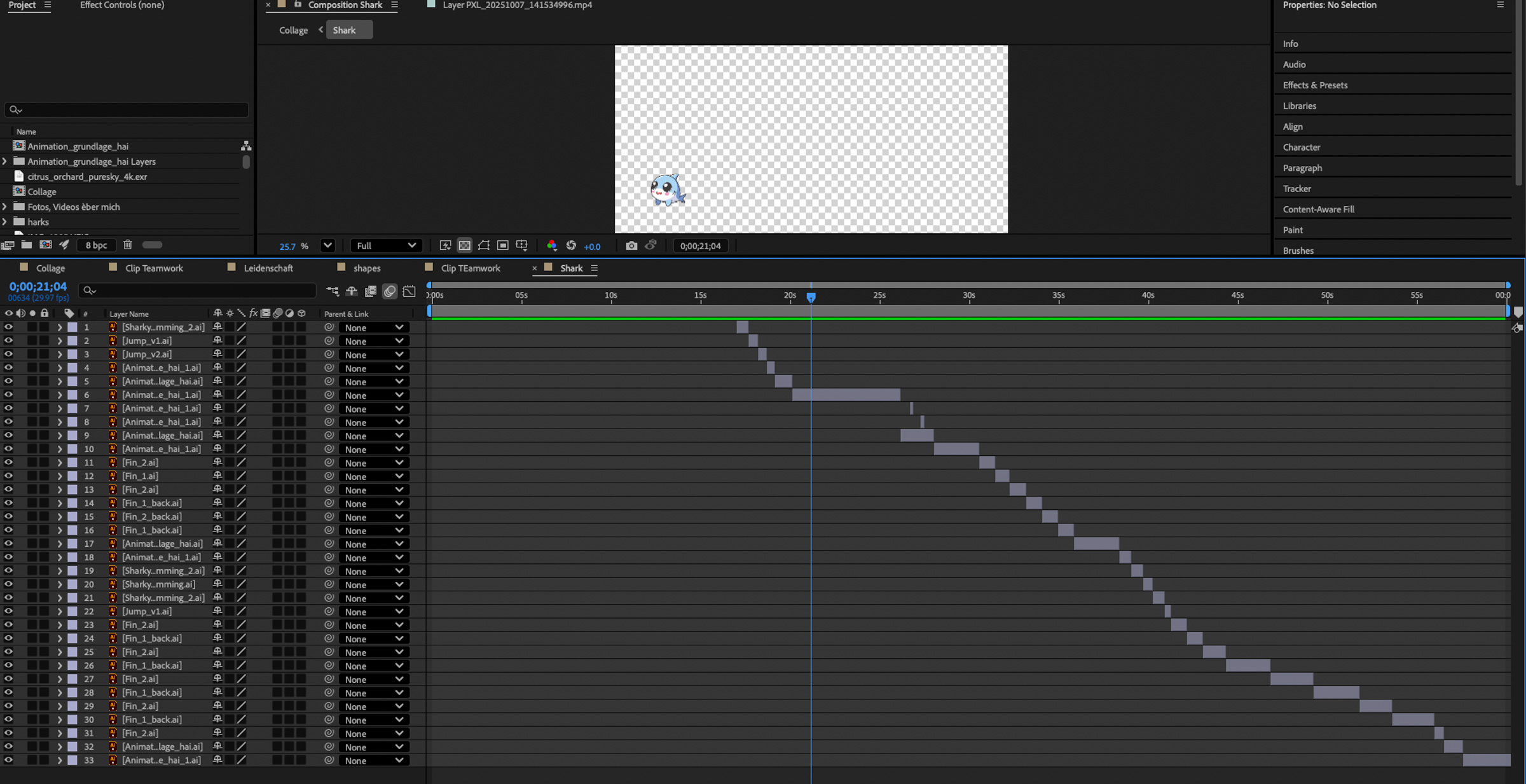 Damit das Ganze nicht zu technisch wirkt, wollte ich auch etwas Humor einbringen. Deshalb habe ich Jaws eingefügt, er sollte eigentlich das „Monster“ des Ozeans darstellen, wird aber missverstanden und symbolisiert mein freundliches, anderes Ich. Die Idee dahinter war, zu zeigen, dass Haie im echten Leben eigentlich liebe Tiere sind und nicht so gehasst werden sollten.