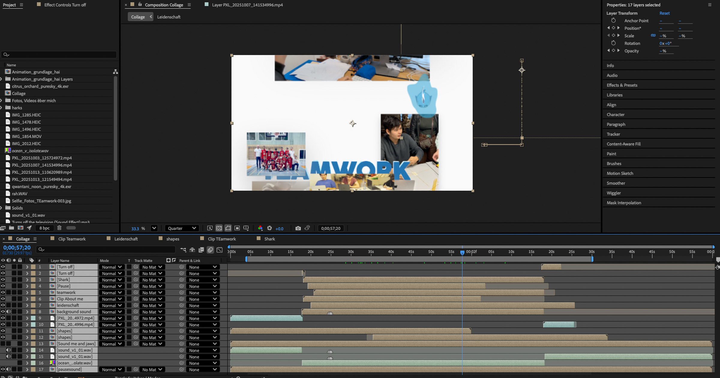 Den gesamten Clip habe ich in After Effects erstellt. Ich habe dabei viel mit der Z-Achse, der Kamera und verschiedenen Precompositions gearbeitet. Effekte wie den Blitz am Anfang und Ende habe ich mit Hilfe eines Tutorials umgesetzt. Und die Stimmen habe ich mit Adobe Audition bearbeitet.